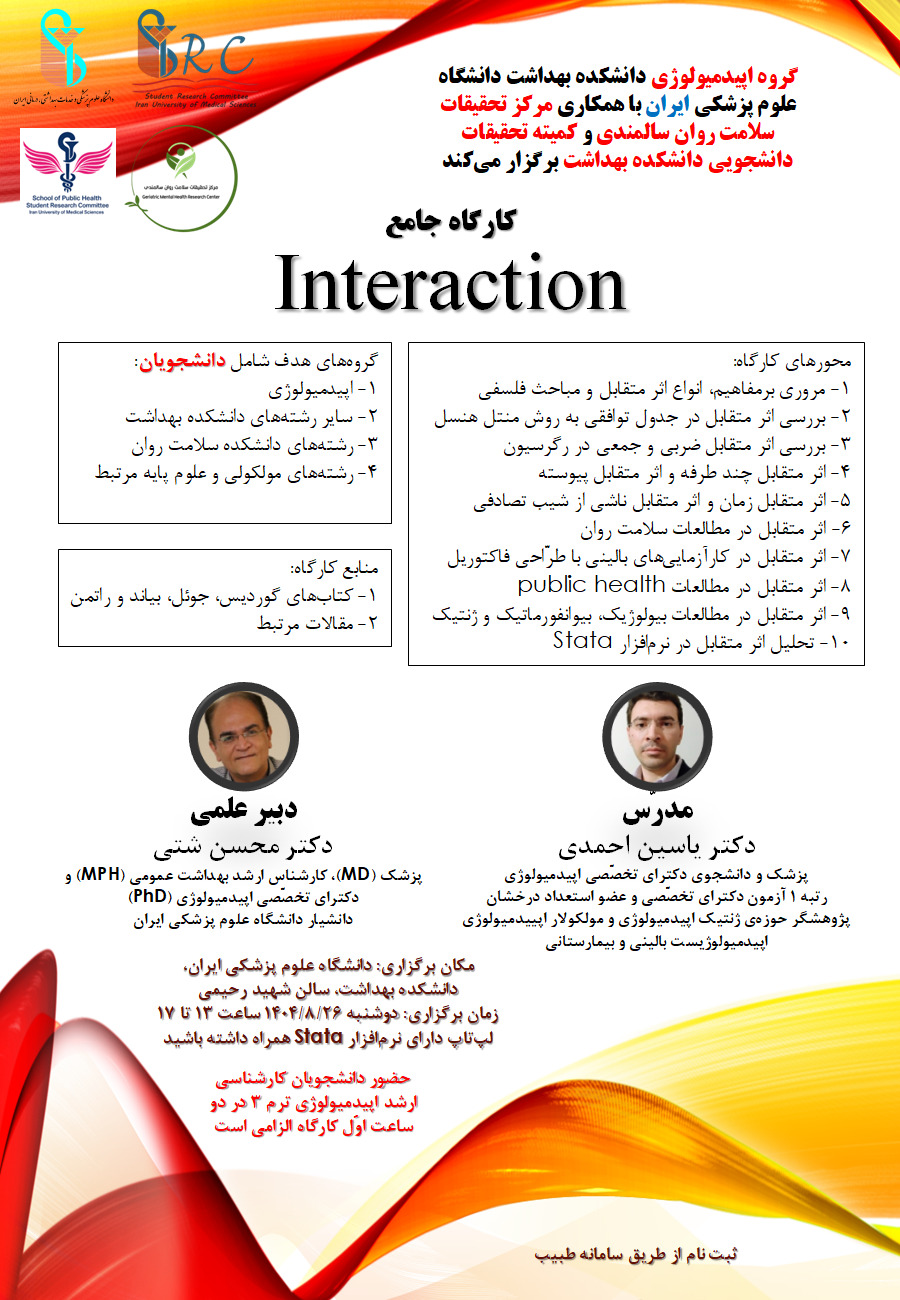 گروه اپیدمیولوژی دانشکده بهداشت دانشگاه علوم پزشکی ایران، با همکاری مرکز تحقیقات سلامت روان سالمندی و کمیته تحقیقات و فناوری دانشجویی، کارگاه حضوری «Interaction در مطالعات» را ویژه دانشجویان برگزار می‌کند.
